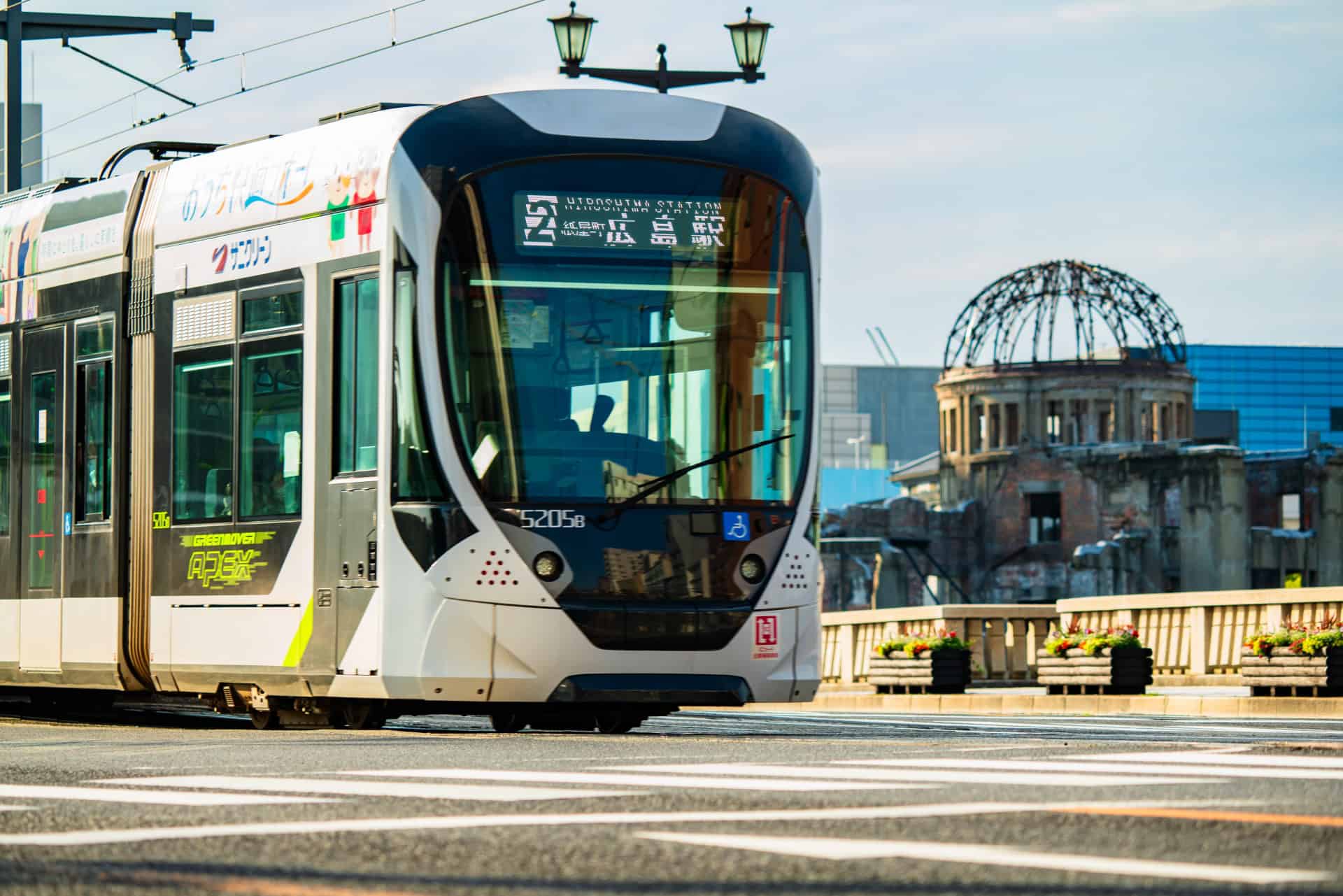 Walking along the path by the Motoyasu River (元安川) on the opposite side of the Atomic Bomb Dome building gives you a clear viewpoint and you can spot trams crossing Aioi Bridge (相生橋), which was the intended target of the bomb, as the original bridge was formed of two bridges that intersected to make a T-shape and could be easily recognised from the air.