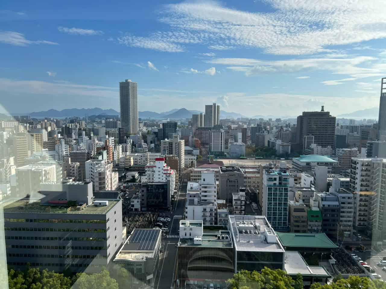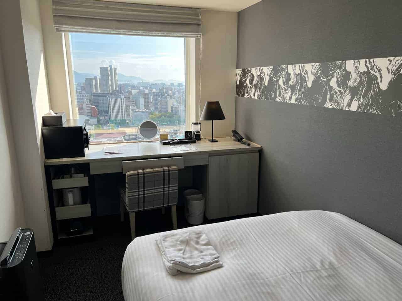Guests can expect comfortable beds, good quality linens, and space to store luggage plus free wifi. A key highlight is the window view, and being a high-rise building, many rooms offer excellent city views, providing a glimpse of Hiroshima’s skyline and surrounding landscape.
