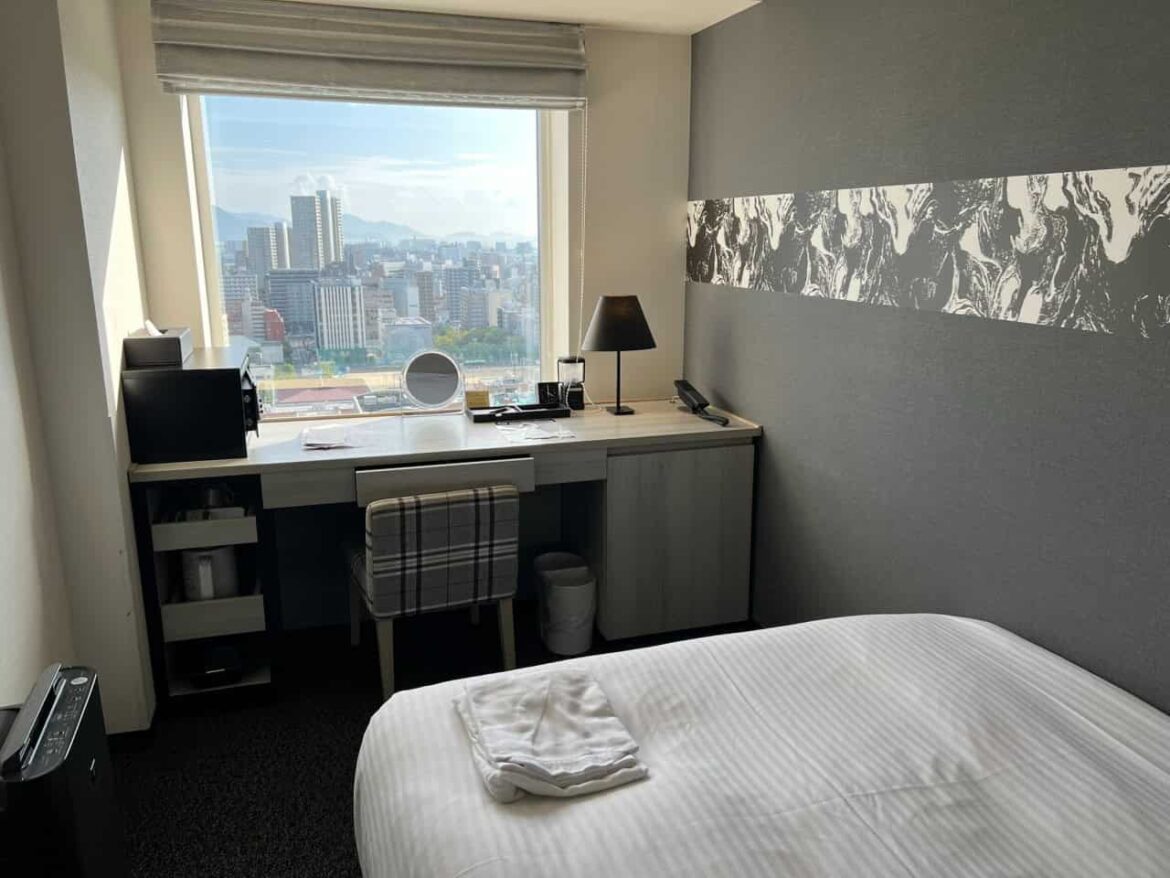 Guests can expect comfortable beds, good quality linens, and space to store luggage plus free wifi. A key highlight is the window view, and being a high-rise building, many rooms offer excellent city views, providing a glimpse of Hiroshima’s skyline and surrounding landscape.